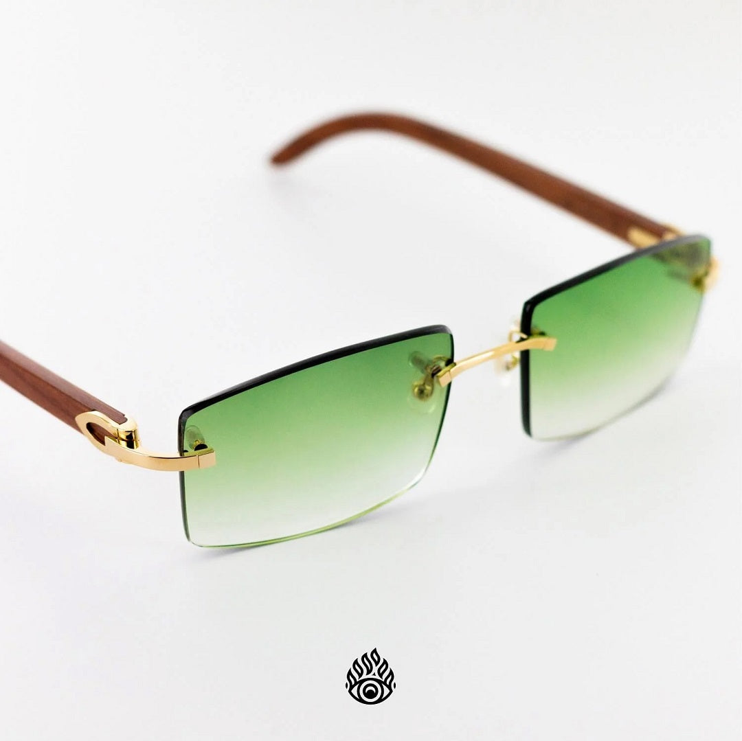 Cartier Light Wood Glasses with Gold C Decor and Green Lens