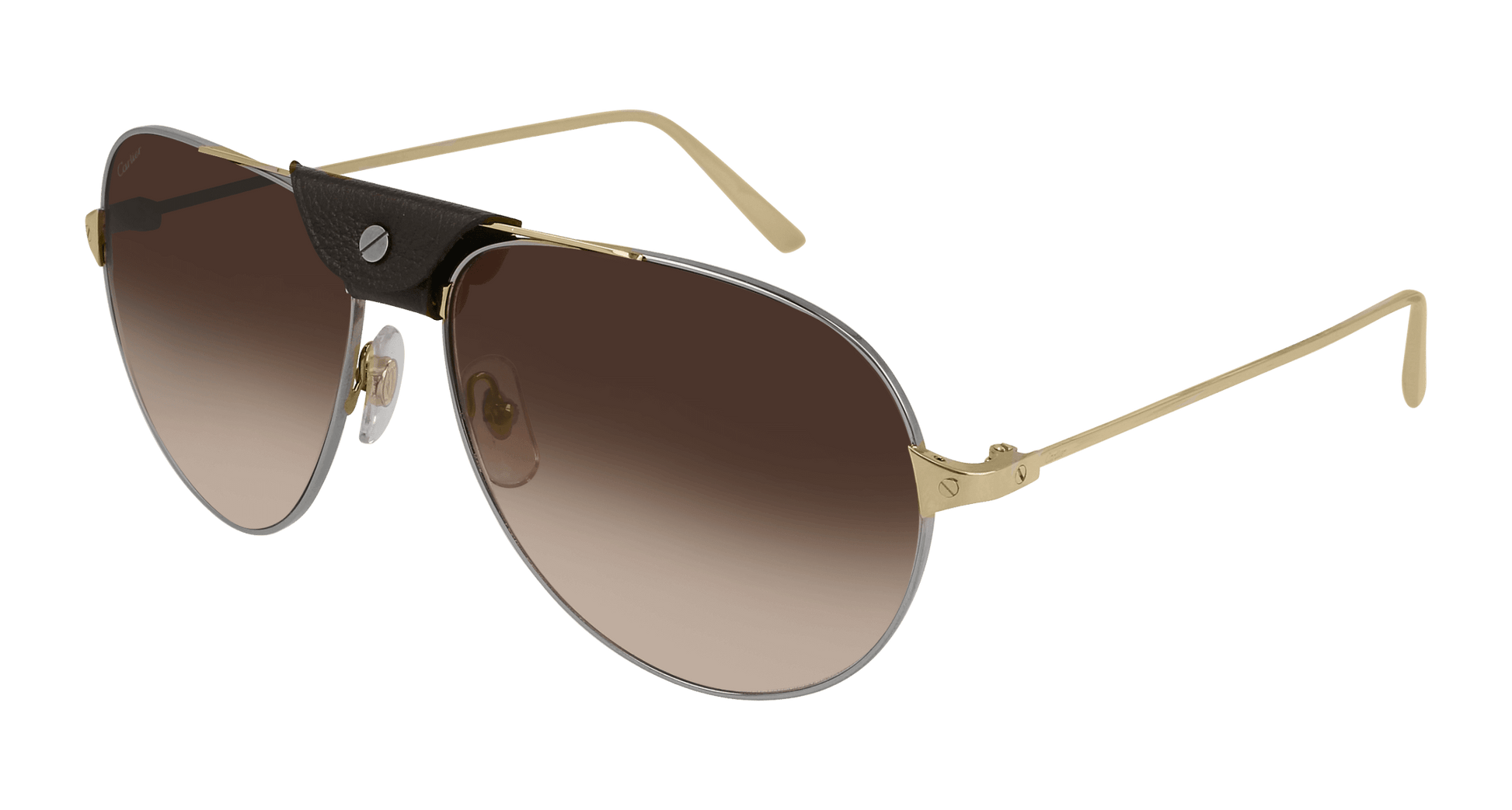 Colour addition on top selling style in Santos de Cartier. Light profiles and temples for a refined and contemporary design. Identifiable Santos screw décor and removable calfskin leather sweatband, symbol of Santos de Cartier collection. Brushed precious finish (in gold) in contrast to smooth precious finish screws (in gold). Cartier logo engraved on temples and Double C Décor signature on nose pads.