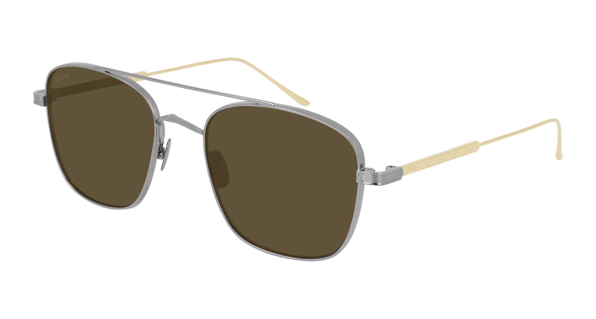 Contemporary interpretation of the C Décor in the new declination of the C de Cartier Elegant pantos shape in titanium with double bridge C de Cartier as an aesthetical and functional element of the structure in the bridge décor for a modern reinterpretation of the Cartier initial Light and comfortable shape thanks to the Made-in-Japan titanium structure Hinge with Godron décor and precious finishes in gold, platinum, ruthenium and PVD Two colour combinations with polarized lenses (001/005 and 002/006) Cartier logo engraved on the temples and Double C Décor signature on the nose pads.