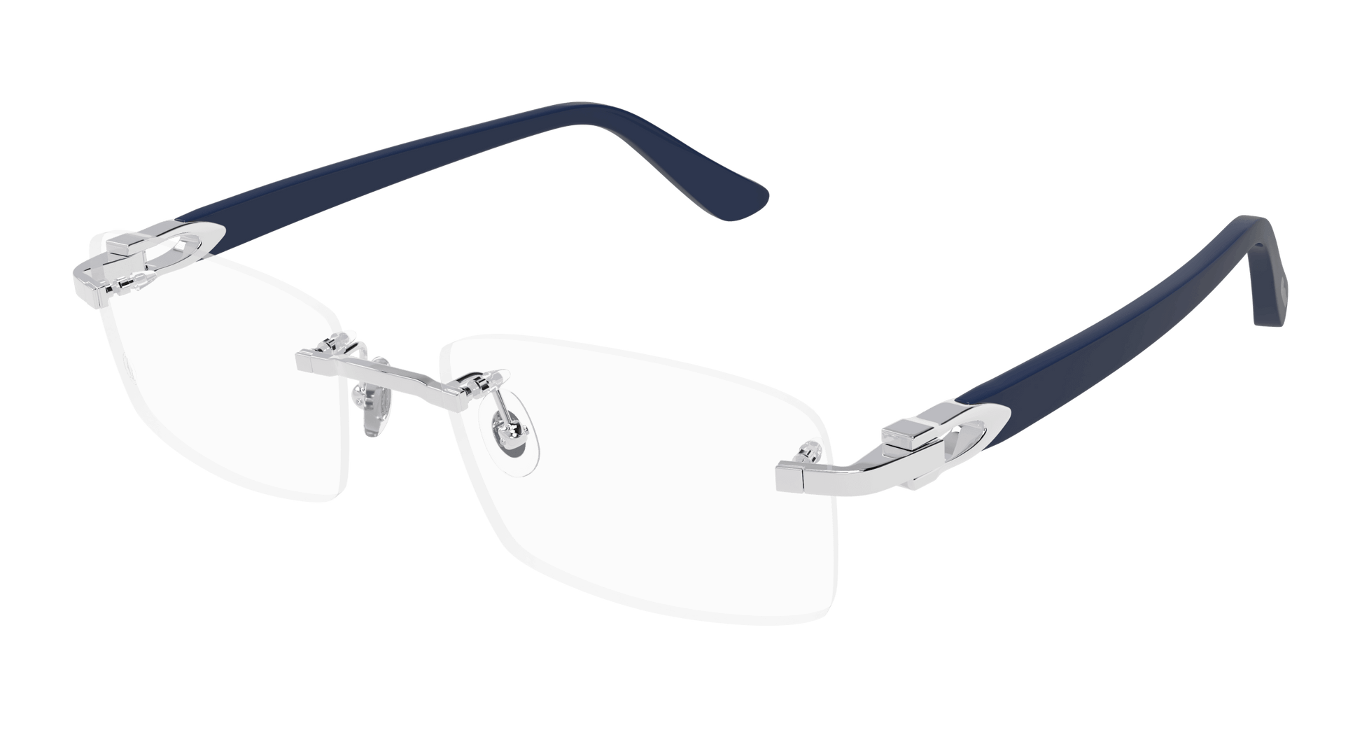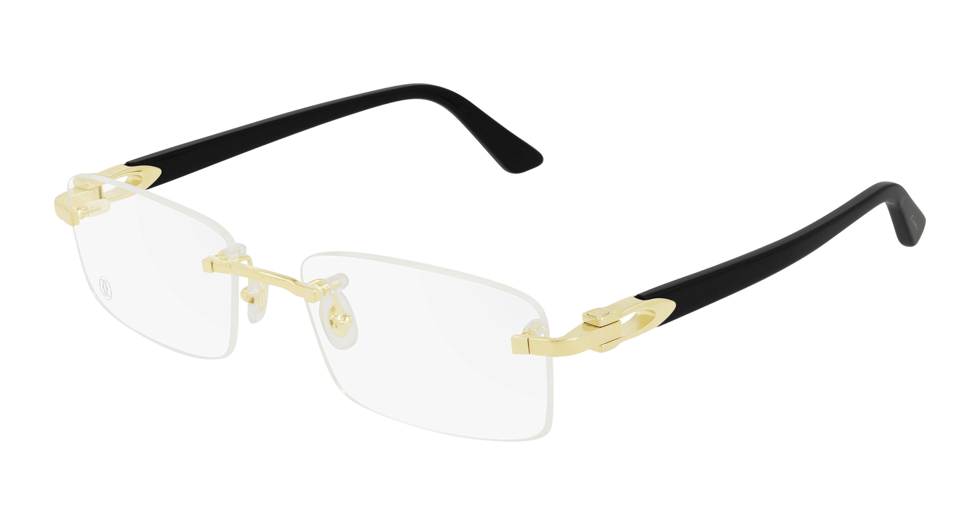 Contemporary yet sophisticated reinterpretation of the historical Décor C temple in combi version. Timeless and easy-to-wear rimless rectangular shape. Iconic Décor C detail perfectly inserted in the acetate temples as aesthetical and functional element of the hinge. Precious finish in gold and platinum combined with varied acetate colours.