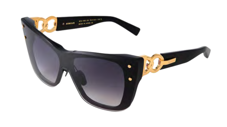 Oversized frame, wide temples, embossed gold-tone Balmain logo on side, gold-tone details and finishes, brown shaded anti-glare lenses, 100% UV protection.