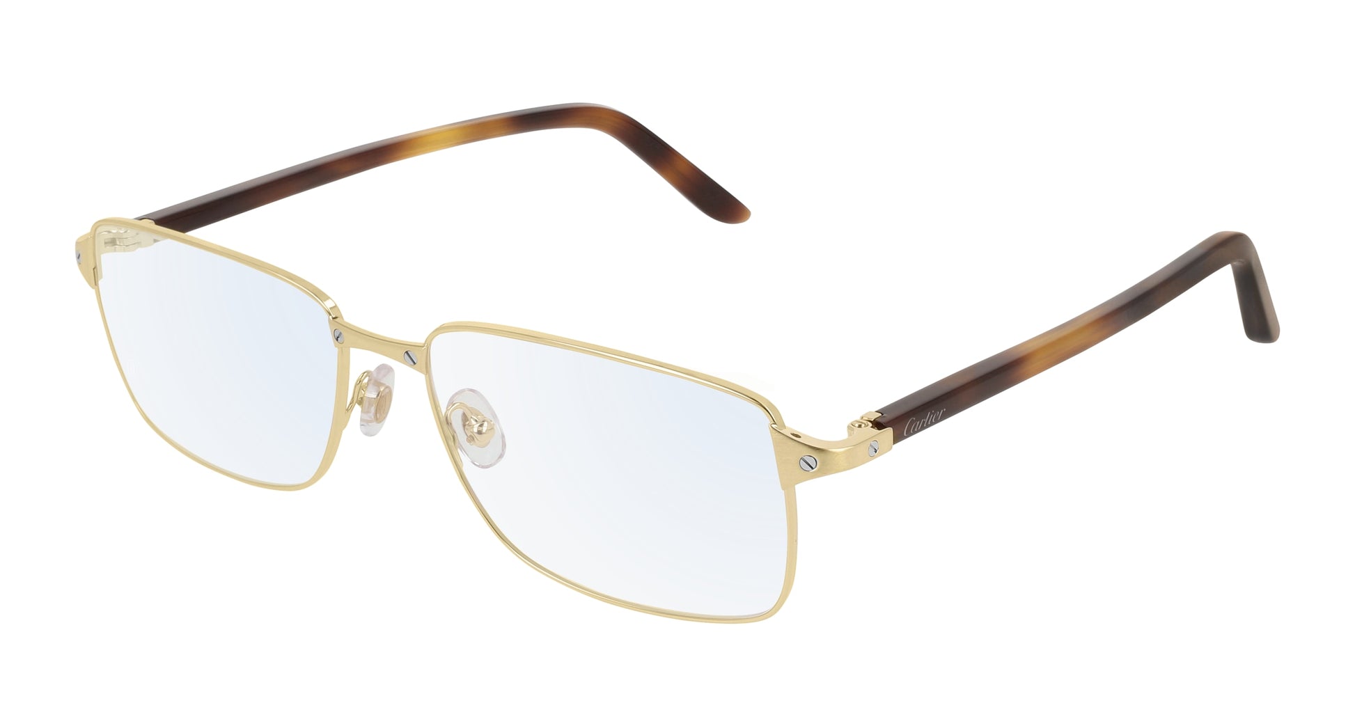 Classic high-rectangular full rim shape, inspired by the Santos universe, for a very elegant and masculine design. Identifiable Santos screw décor, symbol of the Santos de Cartier collection with colour contrast finish.