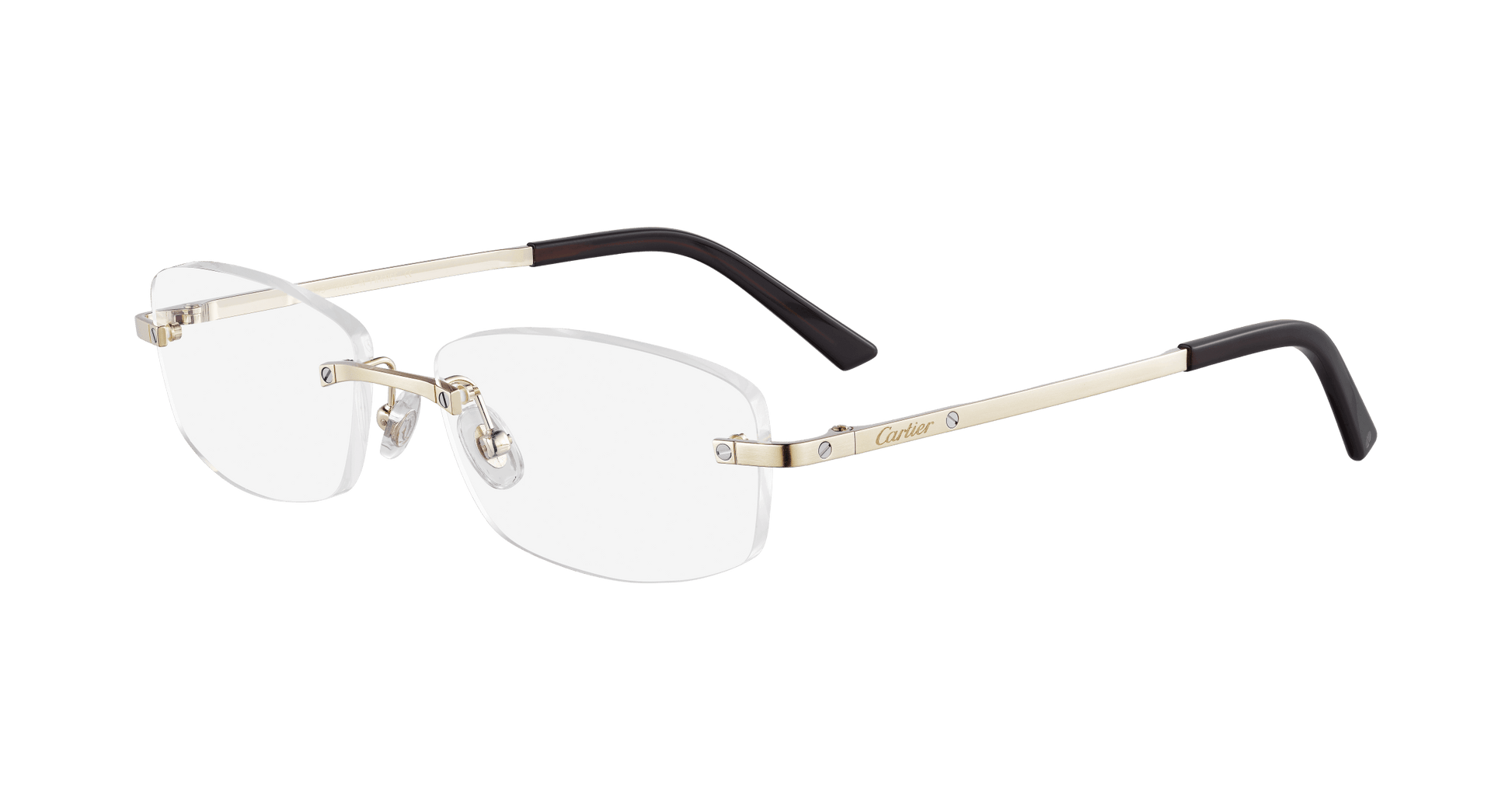 High-rectangular rimless shape in titanium, inspired by the Santos universe, for a very elegant and masculine design. Identifiable Santos screw décor, symbol of the Santos de Cartier collection. Precious finish in gold or platinum.