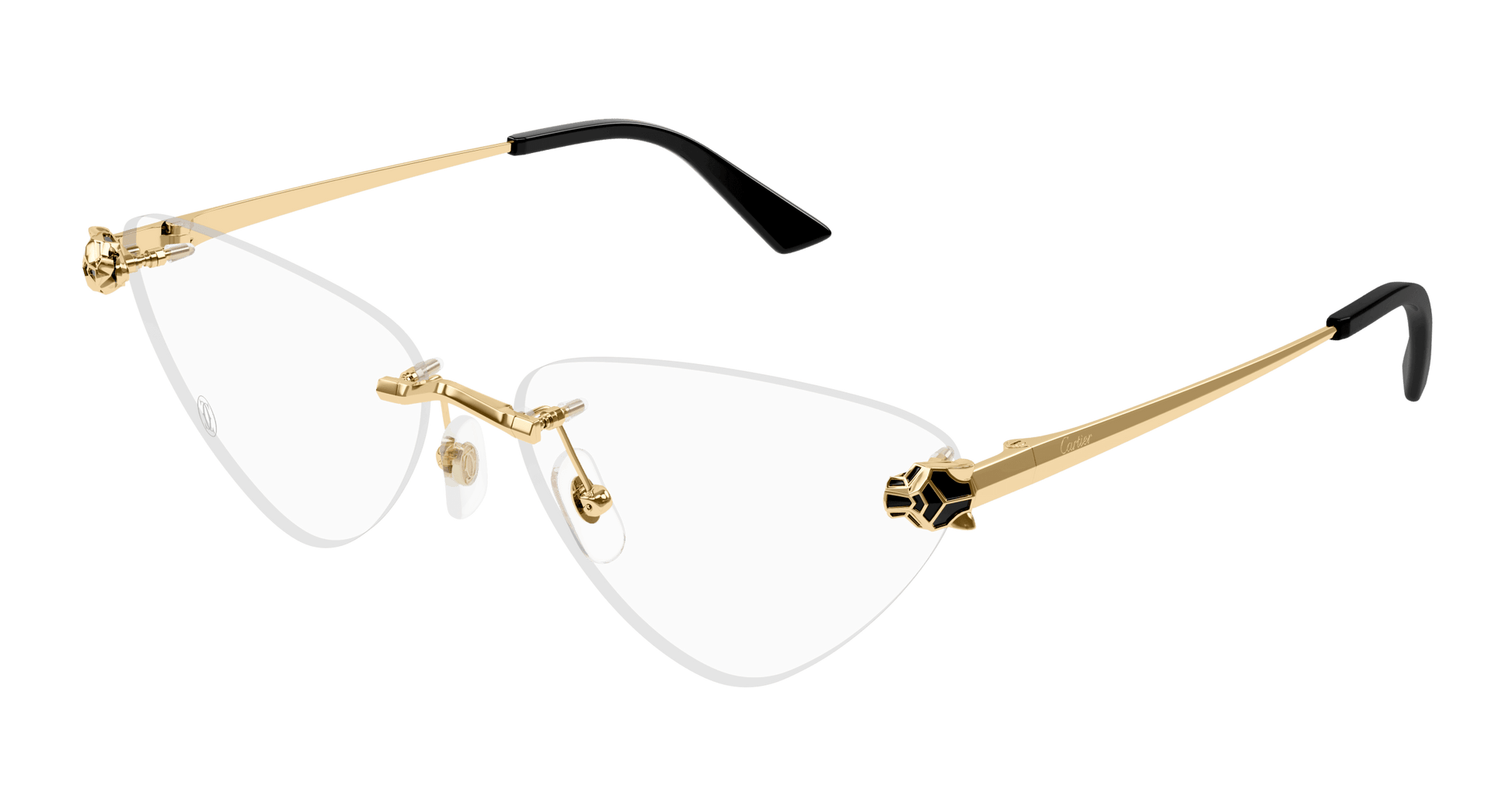 Modern and contemporary cat eye shape with the Panthère head biting the lens for sophisticated and feminine look. Geometric lines of the head, are replicated also in the shapes of the lenses and the bridge. Black enamel detail and precious finish in gold and platinum. Acetate temple tips to guarantee comfort.