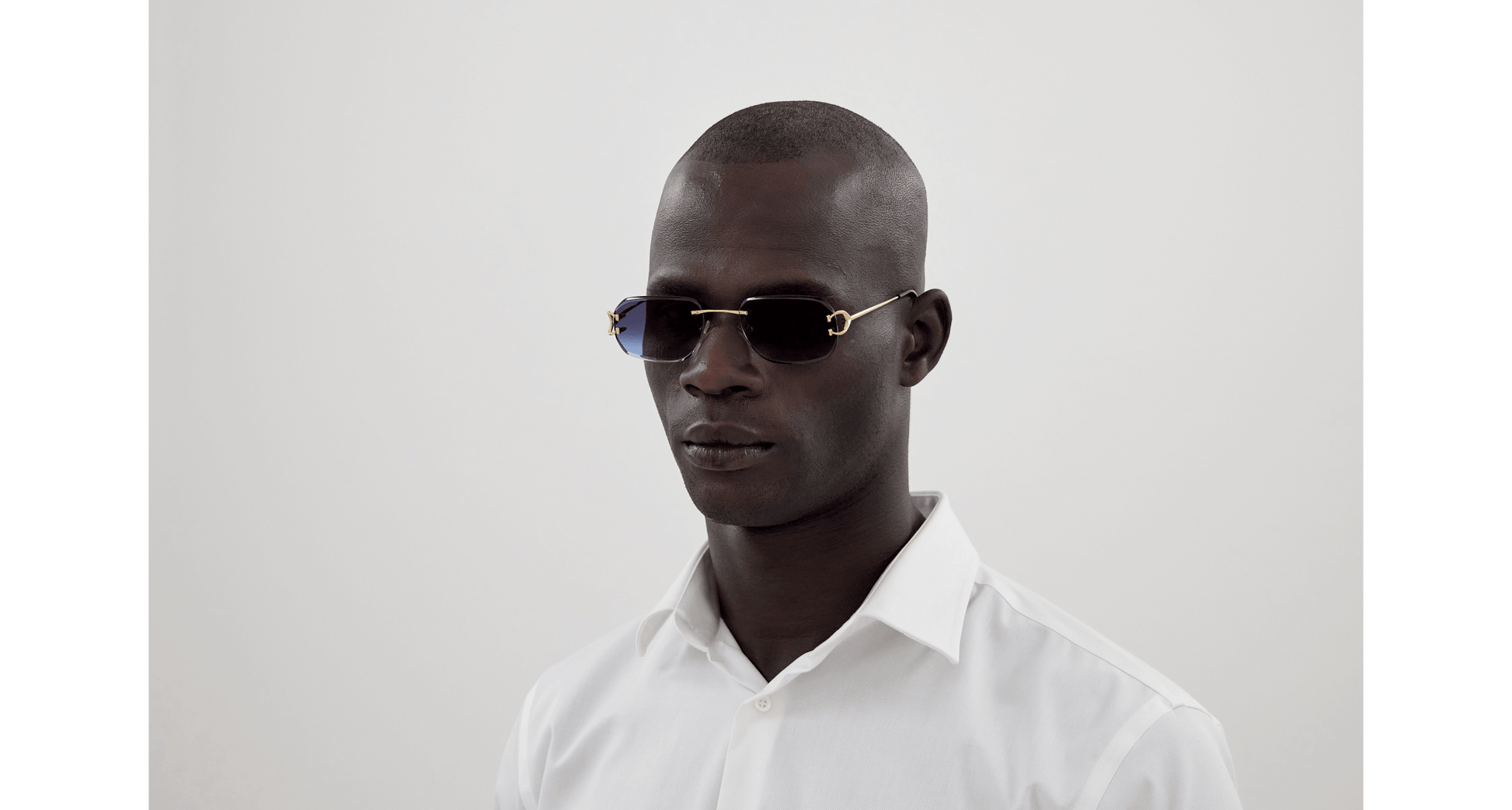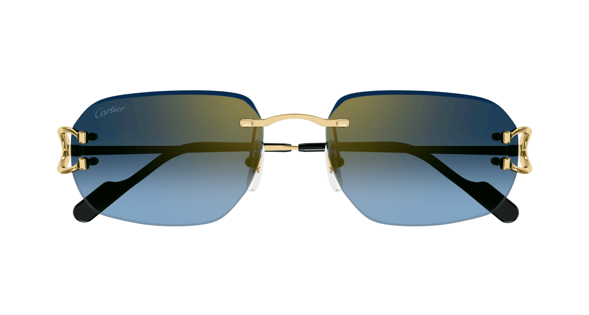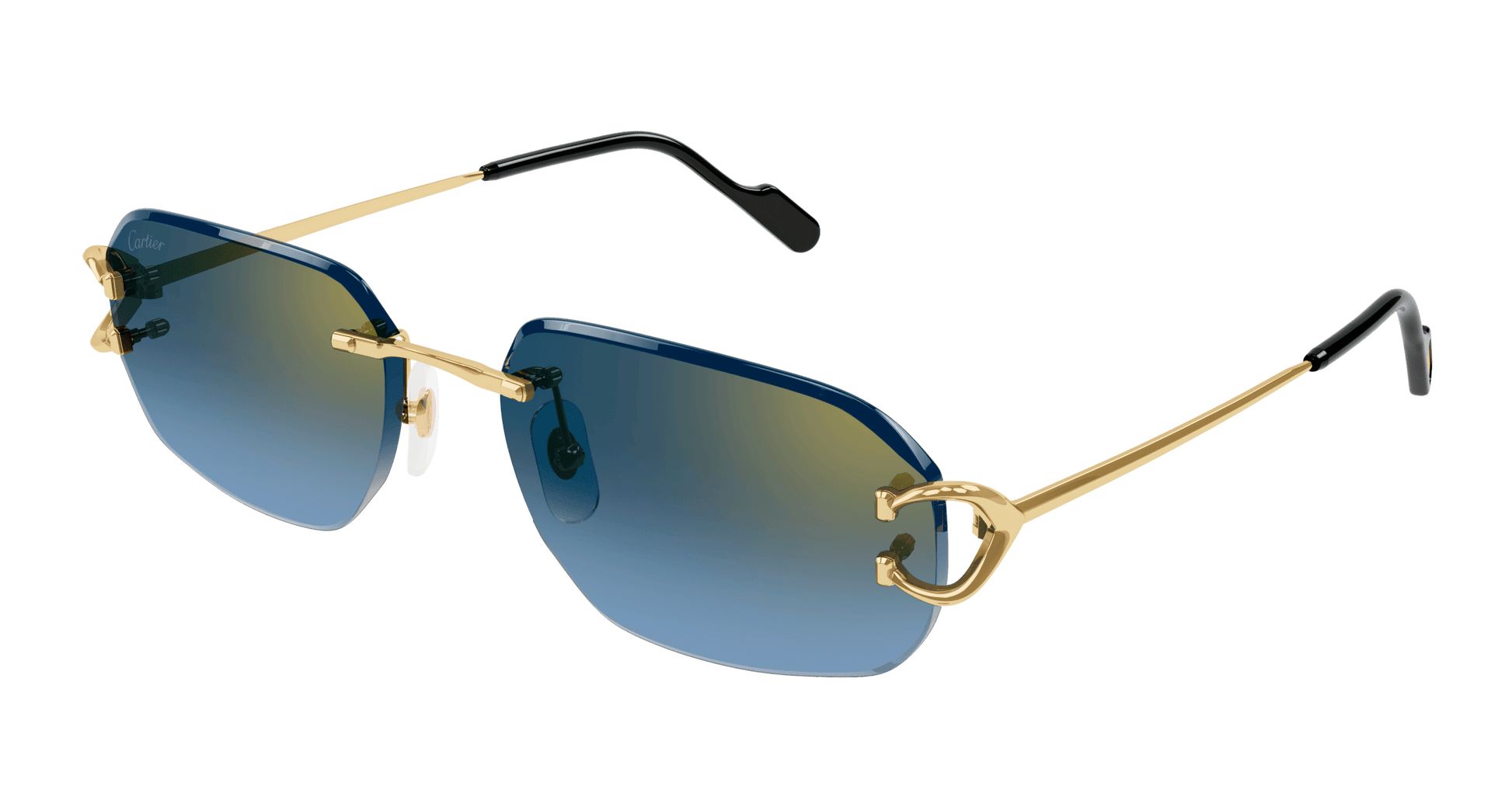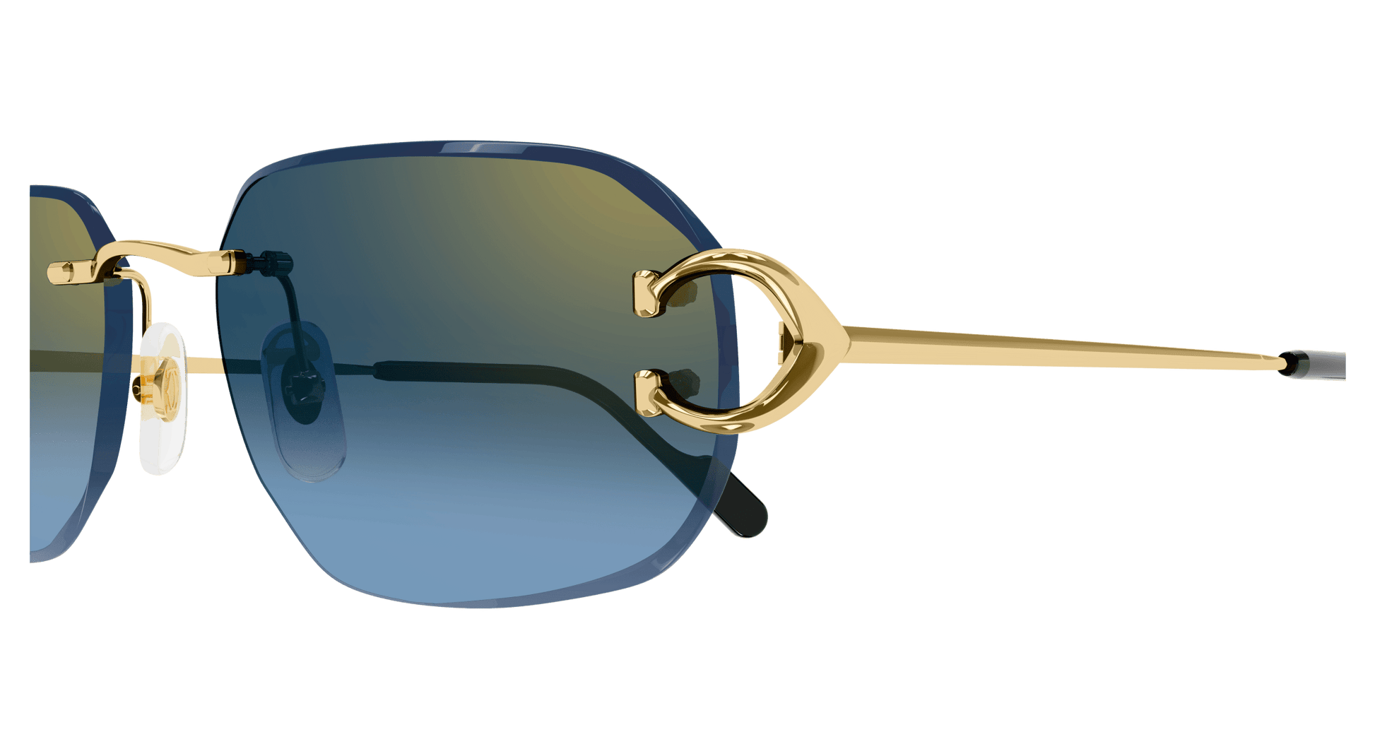 Sunglass rimless construction enriched by the iconic C Dècor detail being a functional and aesthetical element of the metal hinge. New easy-to-wear soft rectangular shape with colourful lenses embellished with a sophisticated beveled treatment to ensure a unisex and modern look. Acetate temple tips with Cartier logo tag to guarantee comfortability. Precious finish in gold.