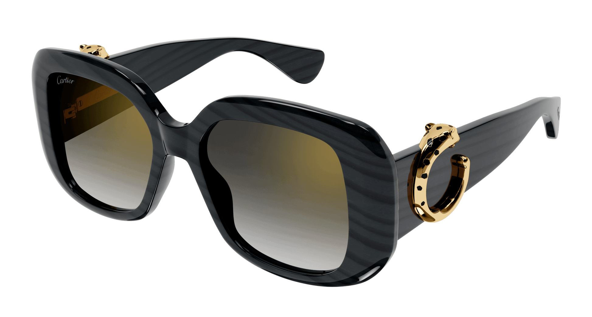 New ultra-feminine acetate construction inspired by the leather goods collection with the three-dimensional Panthère C embellishing the temple. Classic and sophisticated oversize squared shape perfect for an elegant and charming look. Iconic Panthère C detail decorated with hand-made enamel spots played as a jewelry signature on the temples. Precious finish in gold and dedicated acetate colour in synergy with the leather goods collection.