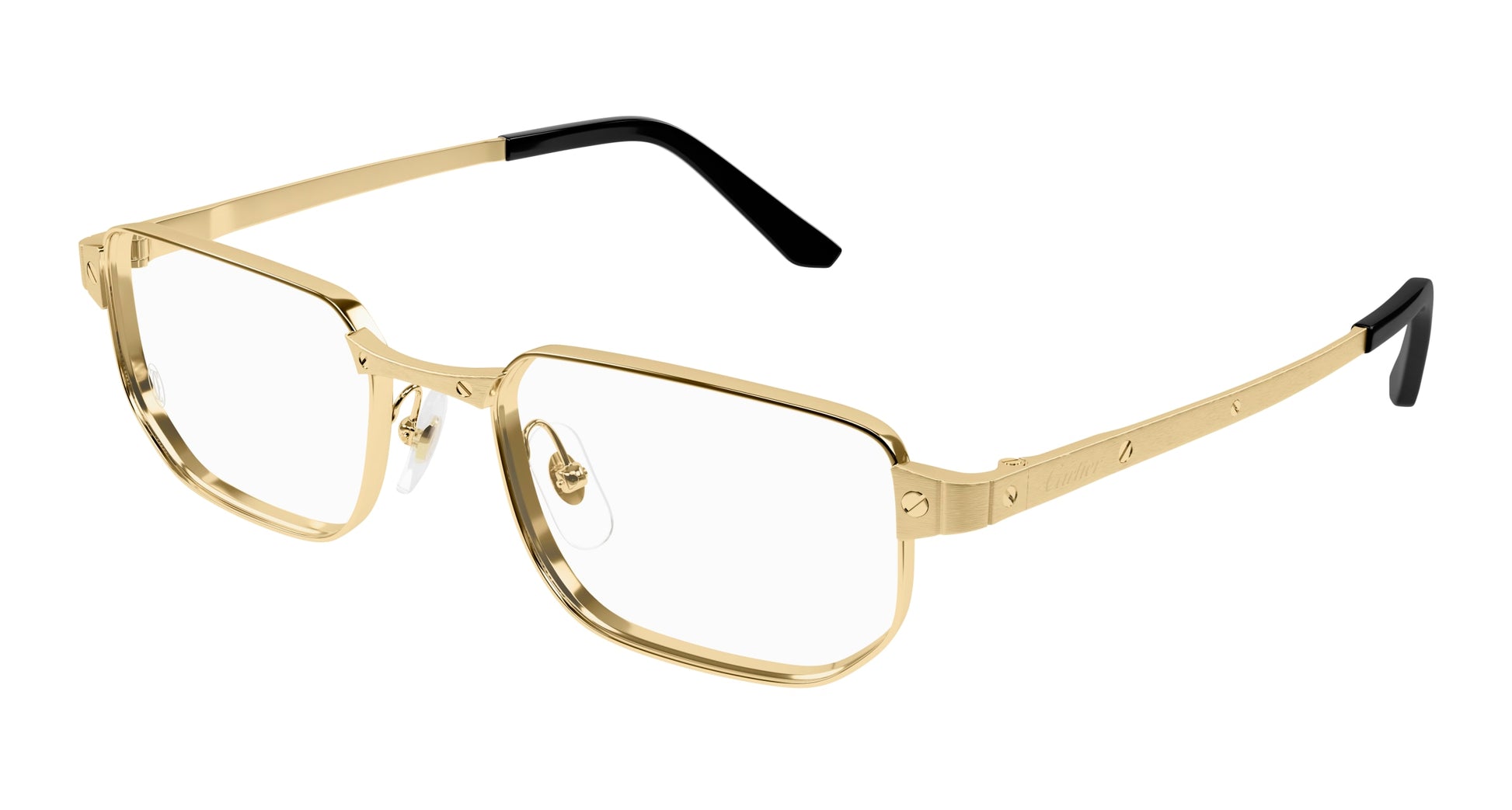 Easy-to-wear rectangular shape in full-rim construction to complete the Santos Classic family with a bold design. Metal hinge enriched with a sophisticated faceted detail inspired by the iconic Santos watch’s metal strap and the recognizable Santos temples are embellished by the Santos screws décor. Acetate temple tips to ensure comfortability. Precious finish in gold or platinum with Cartier logo engraved on the temples