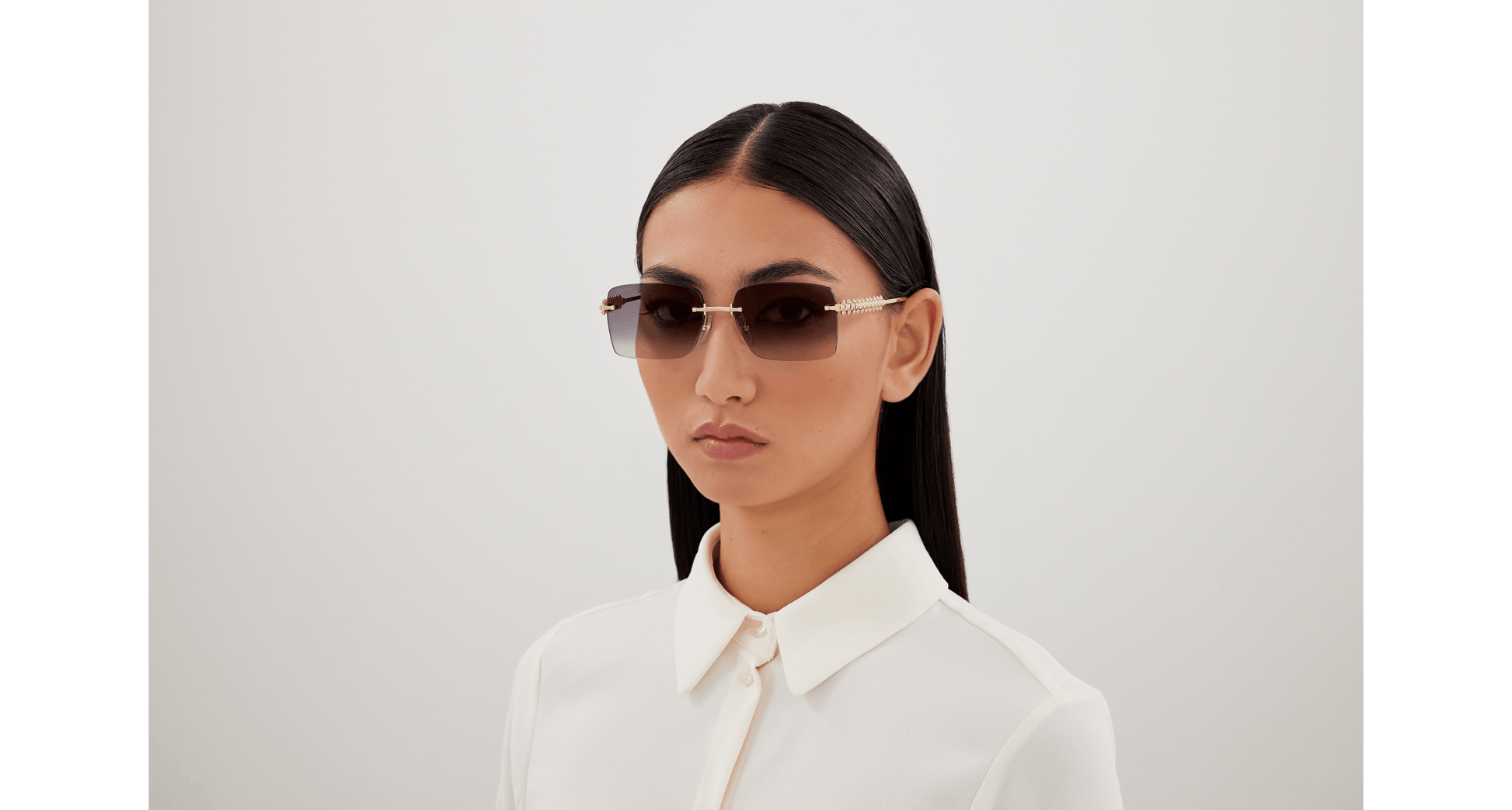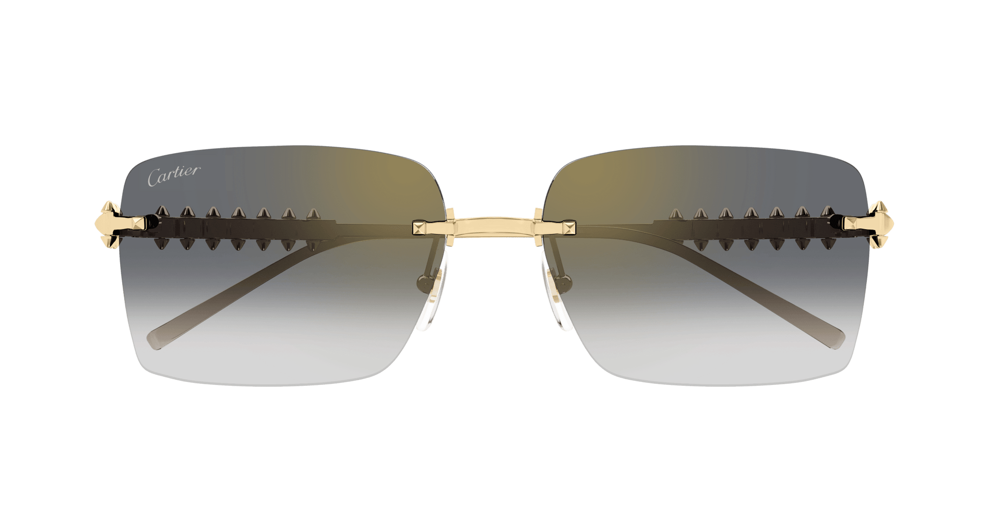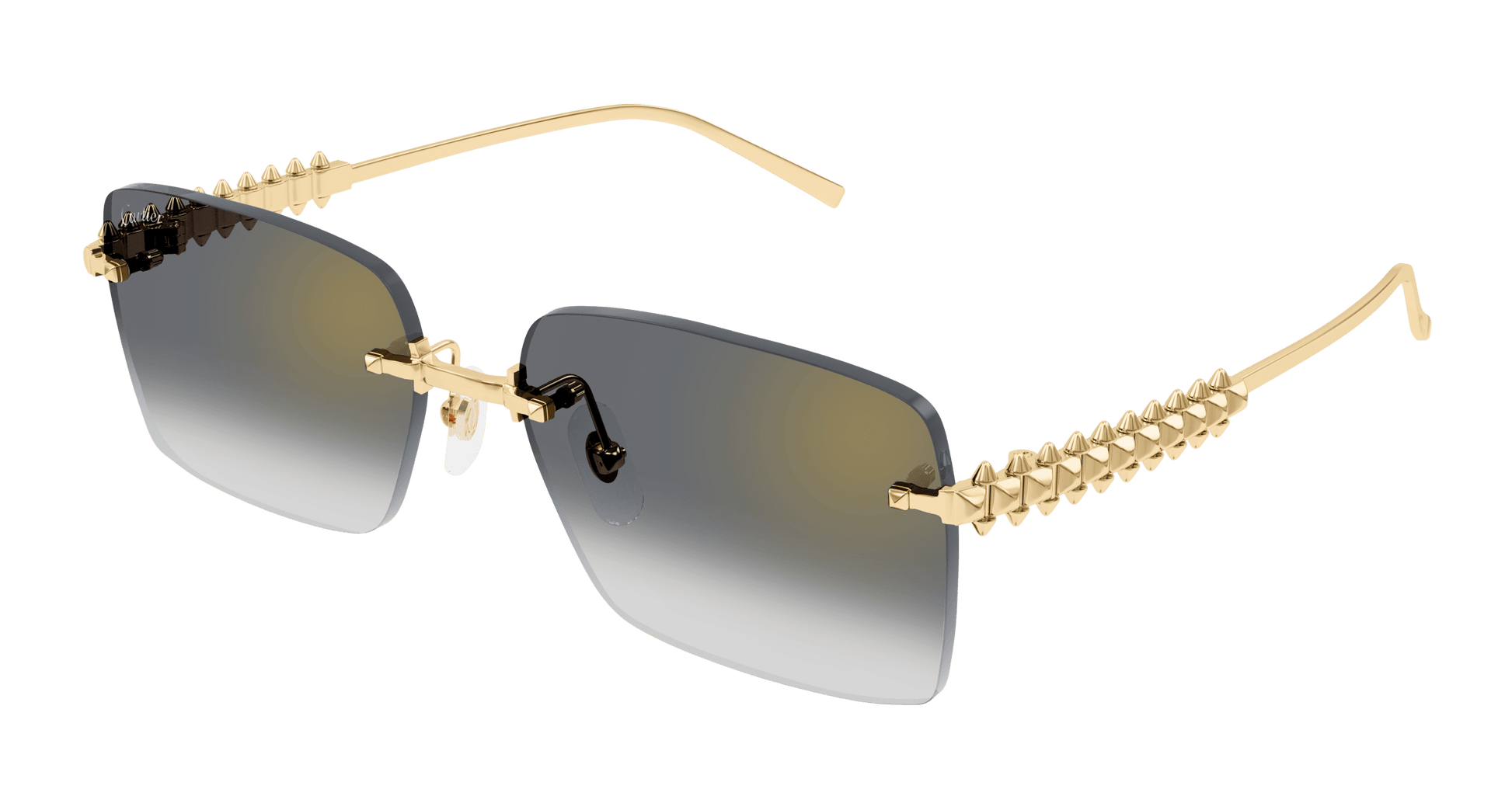 The famous Clash de Cartier icon is faithfully interpreted for the first time in the eyewear collection on the new distinctive metal temples. Classic squared shape in rimless construction for a feminine look. Each Picot is able to move slightly, reproducing the characteristic movement of the jewel. Precious finish in gold enriched with Cartier logo on the temple tips and dedicated lenses on 1 SKU.
