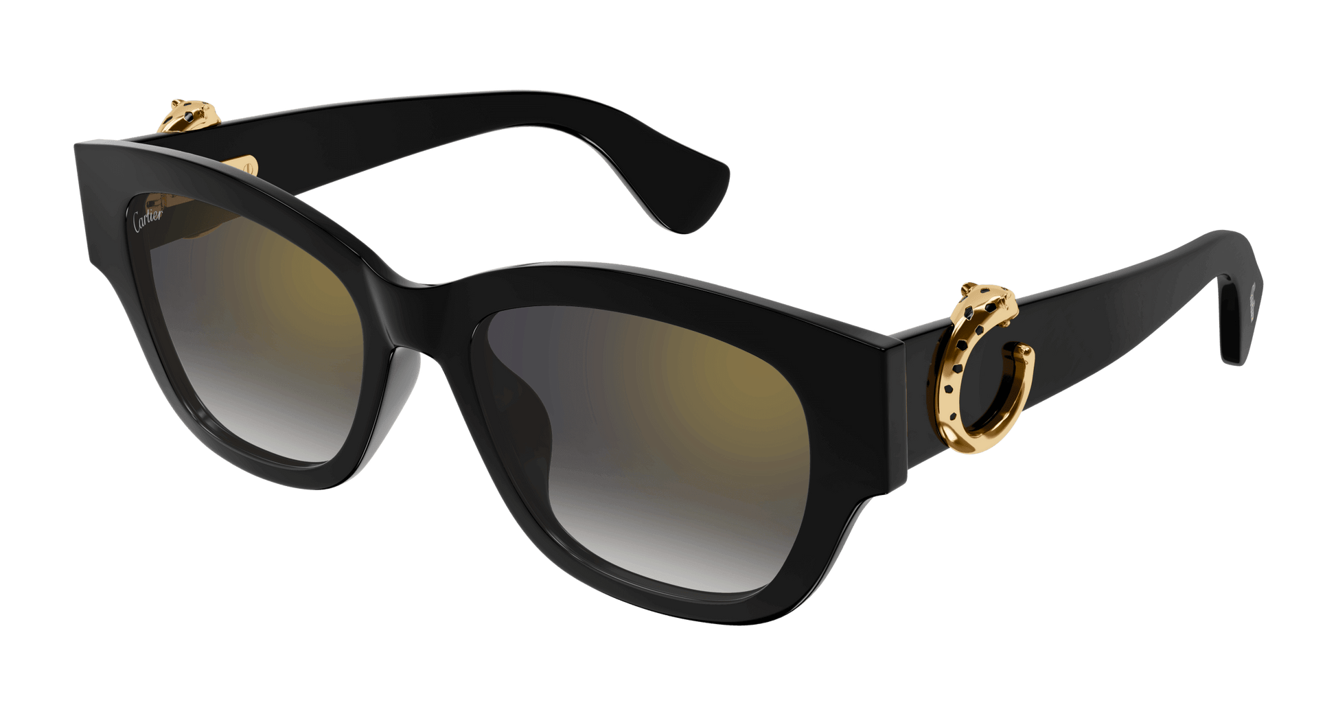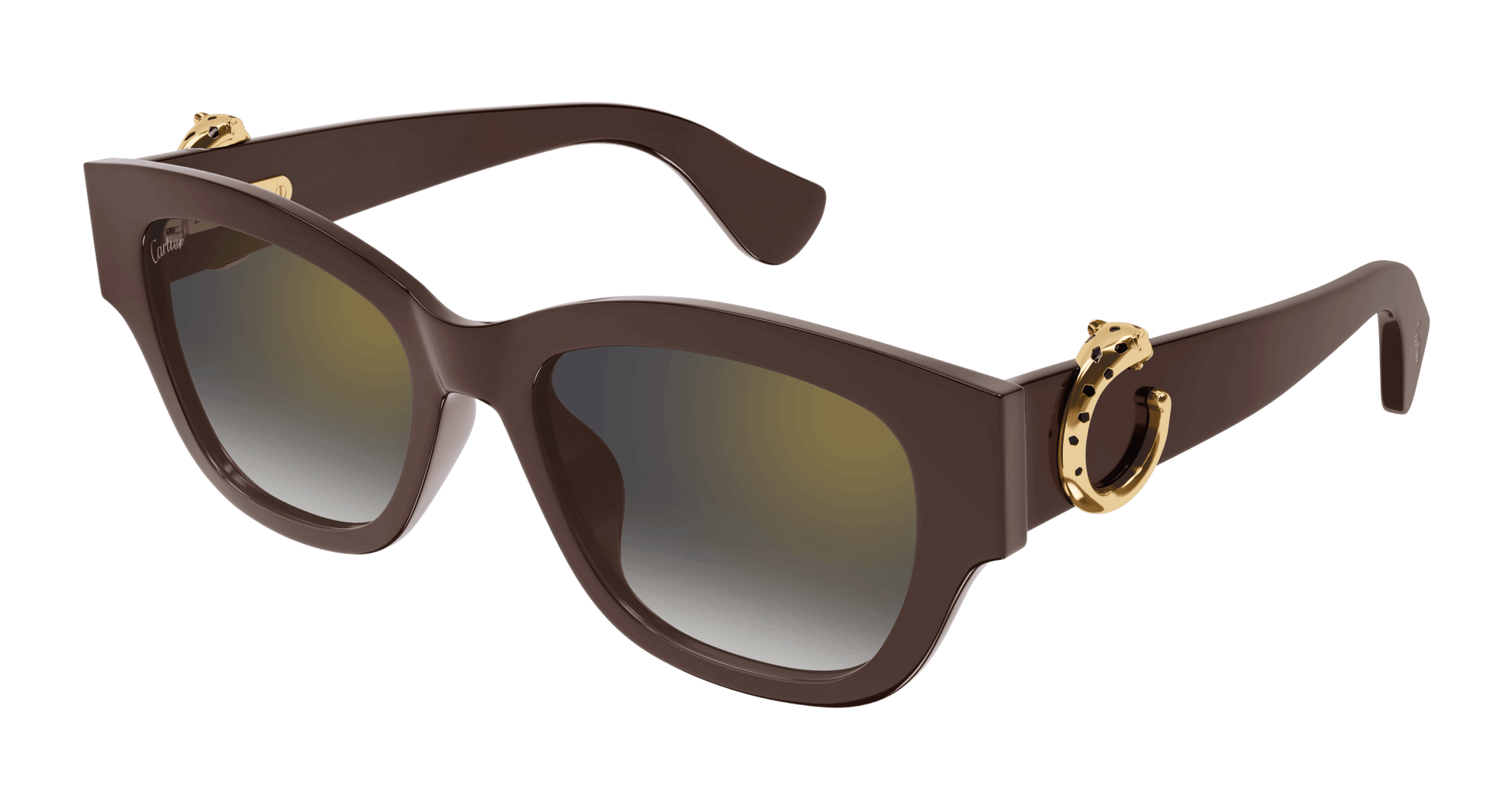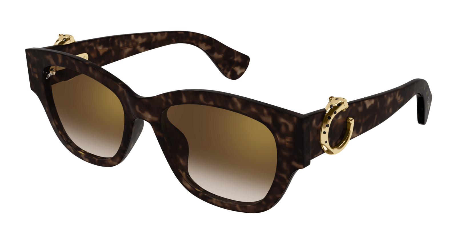 New lighter version of the existing Panthère C aesthetic, characterized by thinner acetate profiles and harmonious proportions, to guarantee comfort and increase wearability. Feminine soft cat eye shape perfect for an elegant and sophisticated look. Iconic three-dimensional Panthère C detail decorated with hand-made enamel spots played as a jewelry signature on the temples. Precious finish in gold or platinum paired with new havana shades on some SKUs.