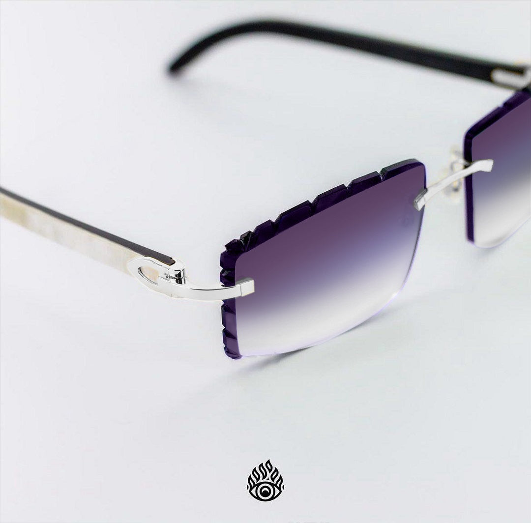 The Iconic Cartier White Buffalo Horn glasses with platinum detail and smoke purple lenses.